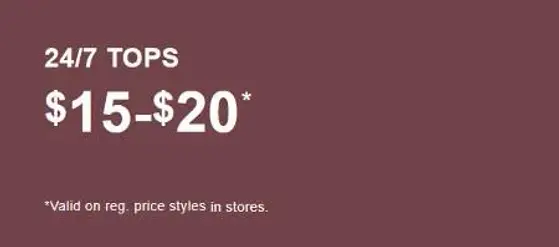 Get it quick! Shop in store and get 24/7 tops now for only $15-$20.