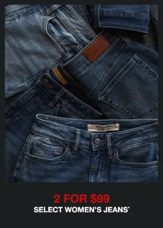 Hurry in and save! Shop in store and get 2 for $99 on select women's jeans.